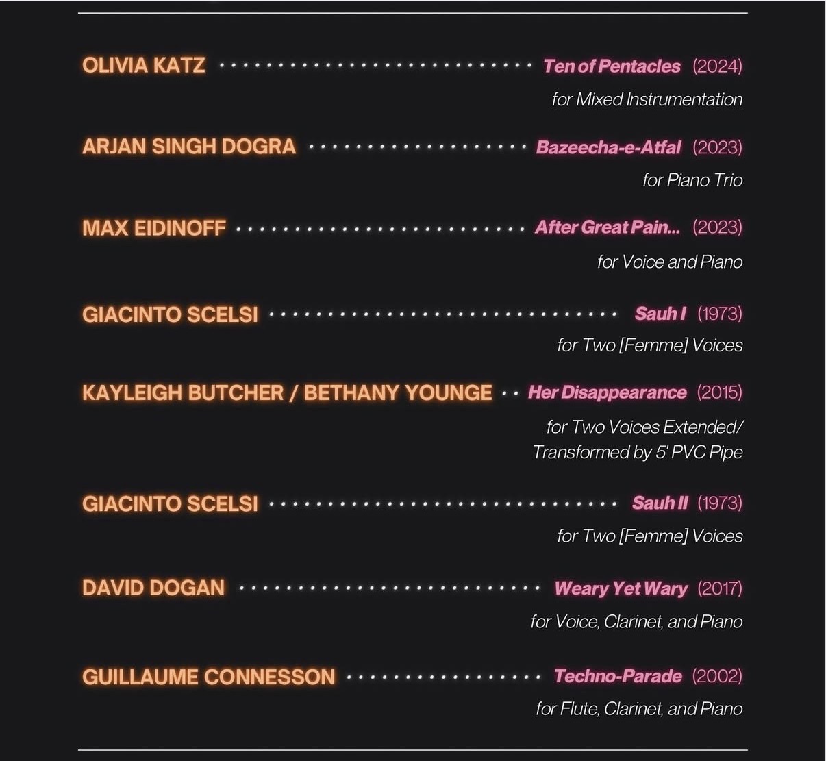 Later, they joined the ensemble in Boston, MA for Two's Company, Three's a Crowd, a duos and trios concert featuring the music of Kayleigh Butcher and Bethany Younge, Guillaume Connesson, Arjan Singh Dogra, David Dogan, Max Eidinoff, Olivia Katz, and Giancinto Scelsi.